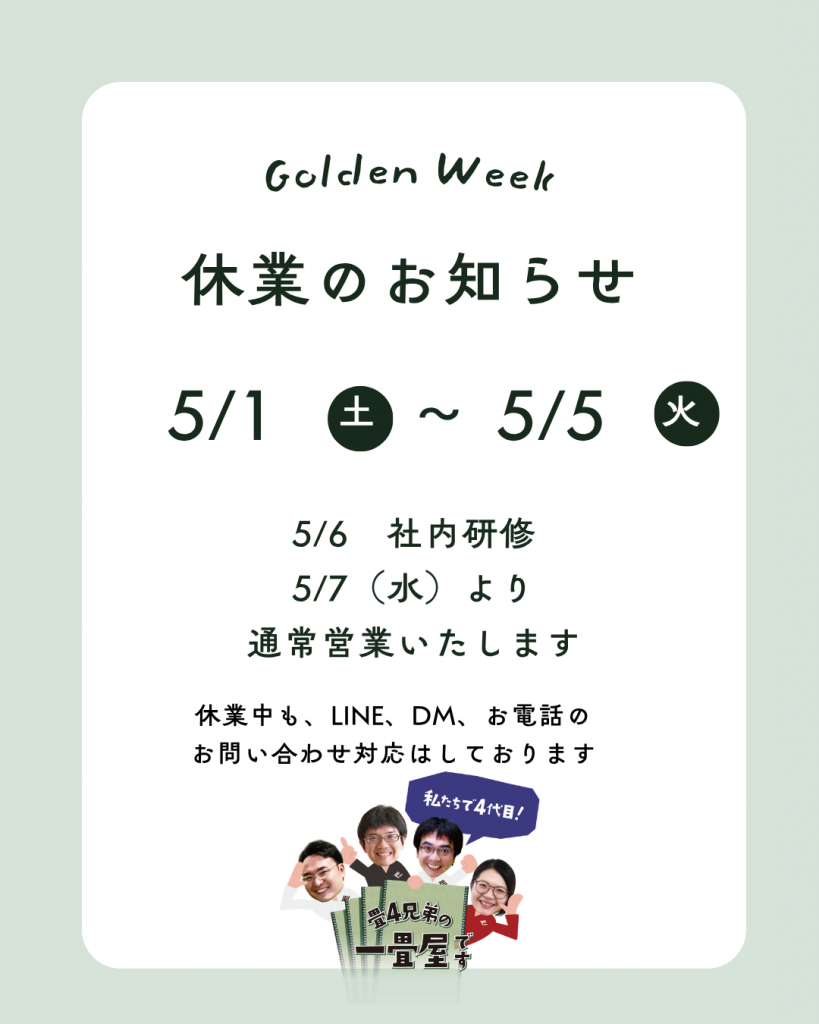 5/6は社内研修のため、通常営業は5/7からとなります。
